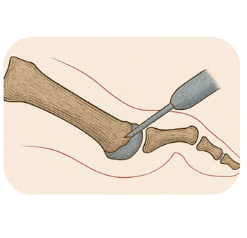 - Une petite incision est réalisée sur le côté médial du gros orteil.