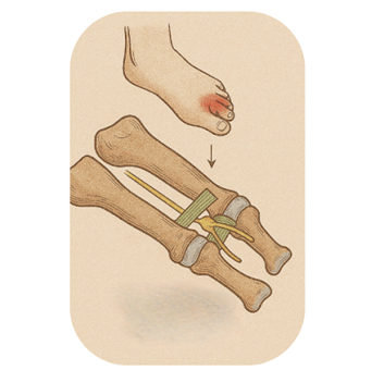 - Une petite incision (de 1 à 2 cm) est réalisée sur le dessus du pied, entre les métatarsiens concernés.