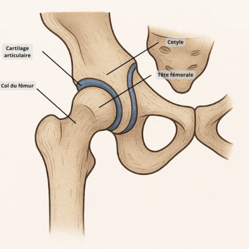La coxarthrose, ou arthrose de la hanche, se caractérise par une dégradation progressive du cartilage de l’articulation de la hanche. Cette usure peut aller jusqu’à la disparition complète du cartilage, exposant l’os de l’articulation. Lorsque cela se produit, les mouvements deviennent douloureux, car l’articulation fonctionne « os contre os », un peu comme une voiture roulant sur ses jantes, entraînant un frottement direct et très douloureux.